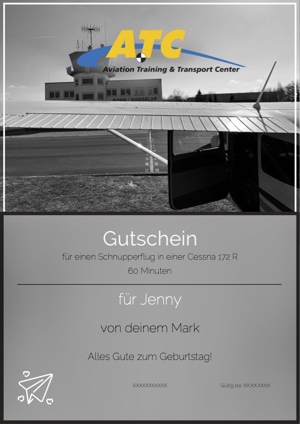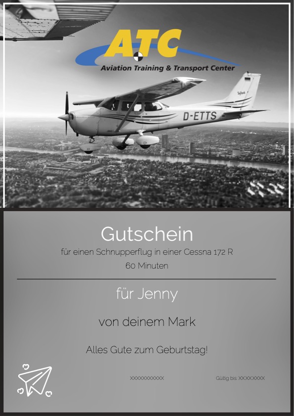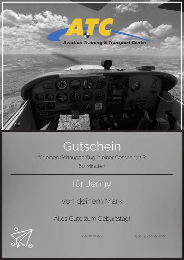 Wenn Sie selbst die Kontrolle über ein Flugzeug übernehmen wollen oder dieses einzigartige Erlebnis verschenken möchten, können Sie sich hier bei uns ganz bequem einen Gutschein bestellen.